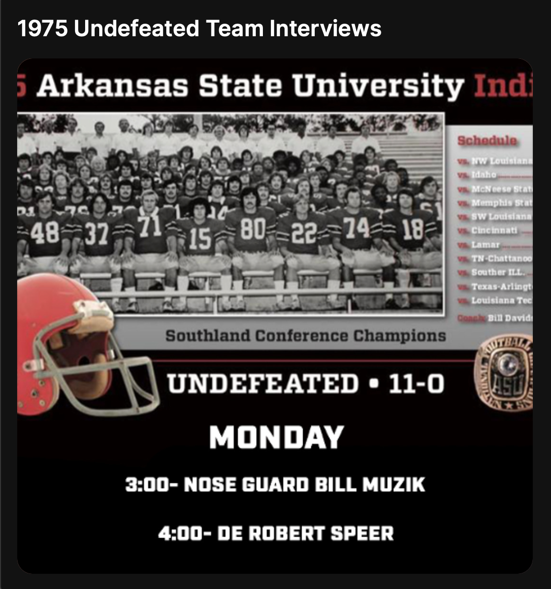 Cade Carlton of The Drive was joined by numerous members of the 1975 Arkansas State undefeated football team (11-0 and nowhere to go) and additional guests to recap the year and celebrate 50 years of the perfect season. Interviews include Robert Speer, Bill Muzik, Mike Malham, Randy Reed, Caleb Garner, David Luter, Rob Wiley, Eddie Morgan, Roy Painter, Jerry Muckensturm, Steve Stinnett, Jamie Klipsch, Dan Mullen, Corbin Lorick, and Coach Tim Keane.
